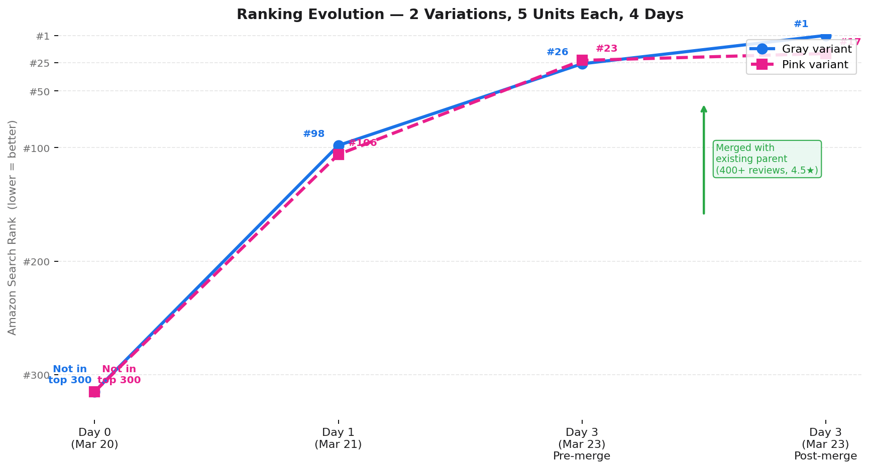 4 | Merge before the campaign ends | While velocity is building, merge with a parent that has strong reviews and rating. The algorithm sees momentum + credibility at the same time. |
